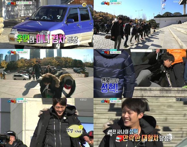 이날 방송에서 멤버들은 계단을 뛰어올라 위에 놓인 깃발을 먼저 잡는 사람이 안락한 승합차에 타는 게임을 진행했다.