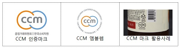 CCM 인증마크와 CCM 엠블렘. 그리고 CCM 마크 활용사례(왼쪽부터). /한국소비자원 제공.