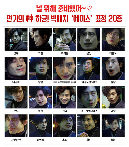 특히, 극 중 최익호(이정재)에게 미션을 던지며 말하는 “널 위해 준비했어”라는 ‘에이스’의 대사와 각 표정마다 ‘올~ 제법인데?’, ‘내가 이 구역의 천재 악당이다’, ‘이 정도쯤이야’, ‘짱벙찜’ 등의 재치 있는 설명까지 더해져 웃음을 자아낸다.