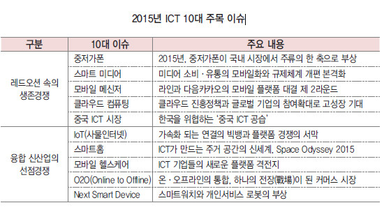 매년 ICT 시장의 10대 주목 이슈를 제시하고 있는 KT경제경영연구소는 2015년을 ’경쟁 패러다임의 새로운 전환기’로 규정하고, 레드오션 단계로 접어들고 있는 기존 스마트 시장은 생존경쟁이 가속화 되고 융합시장은 신산업 선점 경쟁이 본격화되는 시기가 될 것으로 전망했다. 그리고 이에 따른 총 10가지 주목 이슈를 선정했다.