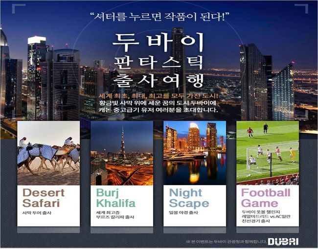 캐논과 두바이 관광청(www.dubaitourism.ae)이 공동으로 진행하는 이번 이벤트는 카메라로 촬영만 하면 화보 같은 사진이 연출되는 멋진 사막의 도시 '두바이'를 경험해 볼 수 있는 기회를 제공하고자 기획됐다.