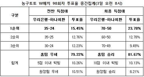 국민체육진흥공단(www.kspo.or.kr)이 발행하는 체육진흥투표권 수탁사업자인 스포츠토토 공식 온라인 발매사이트인 베트맨(www.betman.co.kr)이 오는 4일 오후 7시 춘천호반체육관에서 벌어지는 우리은행-하나외환전을 대상으로 한 농구토토 W매치 98회차 투표율을 중간 집계한 결과, 전체 참가자의 81.67%가 우리은행의 승리를 예상하는 것으로 나타났다.