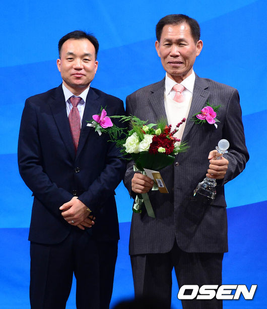 3일 오후 서울 논현동 임피리얼 팰리스 호텔에서 열린 '2014 프로야구 올해의 상' 시상식에서 올해의 공로상을 수상한 박영길(오른쪽) 전 롯데/삼성 감독이 기념촬영을 갖고 있다.