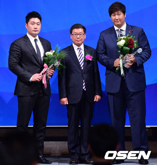 3일 오후 서울 논현동 임피리얼 팰리스 호텔에서 열린 '2014 프로야구 올해의 상' 시상식에서 올해의 특별상을 수상한 오승환과 이대호가 기념촬영을 하고 있다.