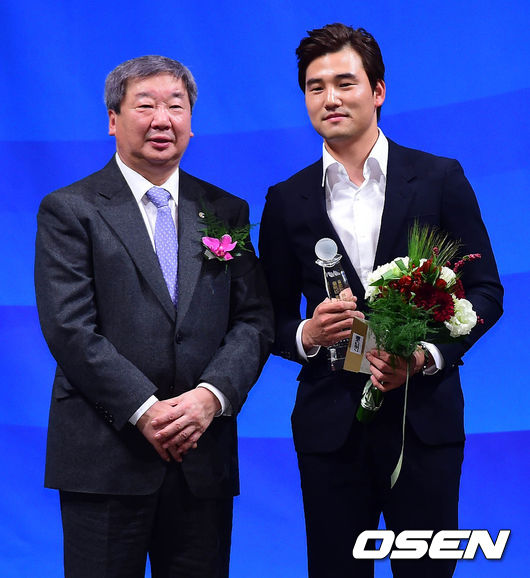 3일 오후 서울 논현동 임피리얼 팰리스 호텔에서 열린 '2014 프로야구 올해의 상' 시상식에서 올해의 매직글러브상을 수상한 김상수가 KBO 구본능 총재와 기념촬영을 하고 있다.