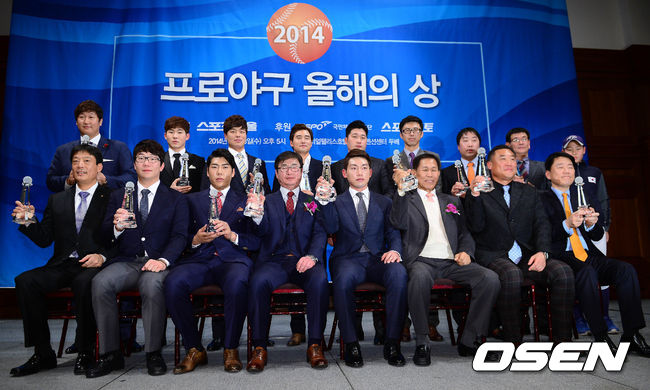 3일 오후 서울 논현동 임피리얼 팰리스 호텔에서 열린 '2014 프로야구 올해의 상' 시상식에서 수상자들이 기념촬영을 하고 있다.