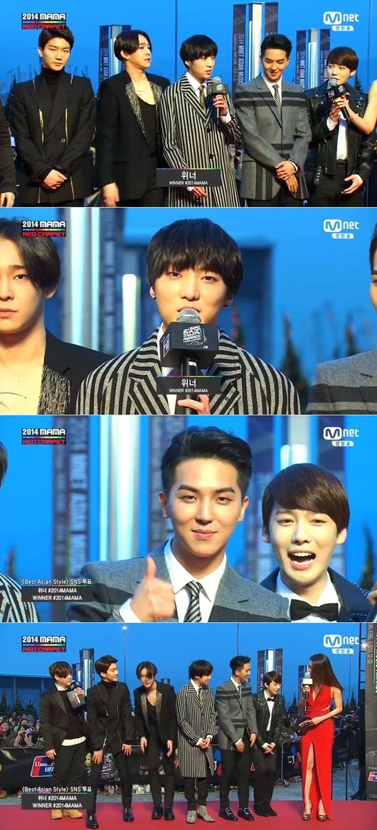 지난 여름 데뷔한 위너는 이날 ‘MAMA’가 첫 출석이다. 리더 강승윤의 인사 후, 송민호는 “여기 와서 기분 너무 좋아”라며 즉흥 랩을 하고 수줍게 웃었다. 그는 “준비를 했어야 했는데 조금 더 연습하겠다”며 재치 있게 수습을 했다.