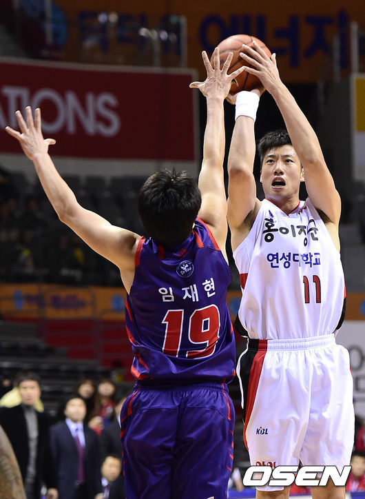 3일 오후 경기도 고양실내체육관에서 열린 '2014-2015 KCC 프로농구 고양 오리온스와 안양 KGC의 경기, 1쿼터 안양 양희종이 고양 임재현의 수비를 두고 3점슛을 시도하고 있다.