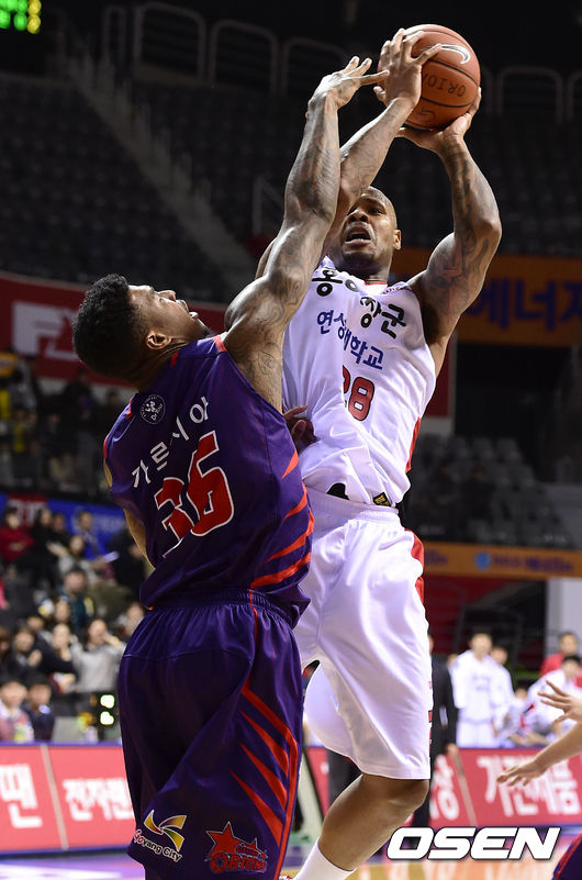 3일 오후 경기도 고양실내체육관에서 열린 '2014-2015 KCC 프로농구 고양 오리온스와 안양 KGC의 경기, 2쿼터 안양 맥기의 슛 시도를 고양 가르시아가 막아서고 있다.