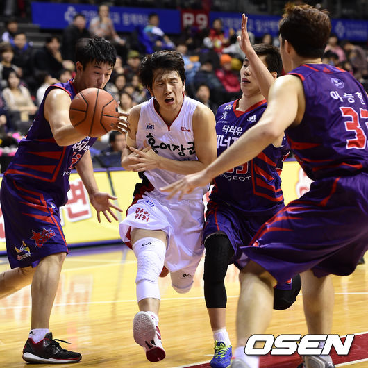 3일 오후 경기도 고양실내체육관에서 열린 '2014-2015 KCC 프로농구 고양 오리온스와 안양 KGC의 경기, 2쿼터 안양 김기윤의 돌파를 고양 이승현, 한호빈,전정규가 막아서고 있다.