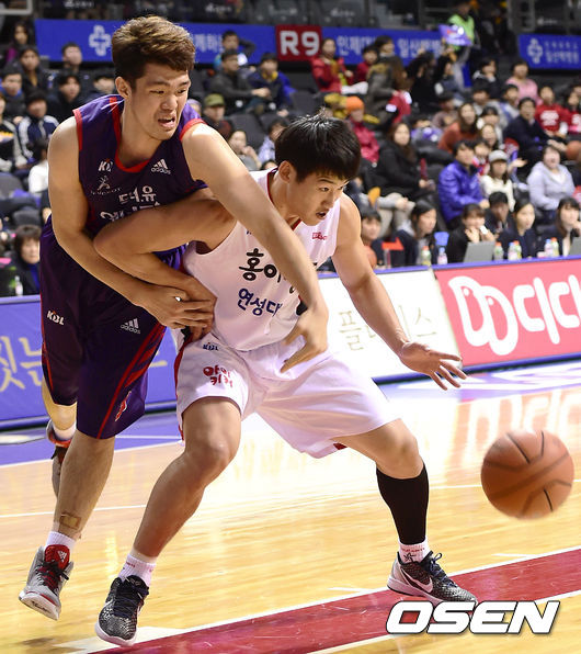 3일 오후 경기도 고양실내체육관에서 열린 '2014-2015 KCC 프로농구 고양 오리온스와 안양 KGC의 경기, 3쿼터 고양 이승현과 안양 이원대가 몸싸움을 벌이고 있다.