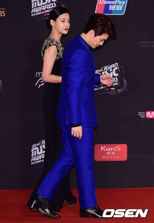 3일 오후 홍콩 아시아 월드 엑스포 아레나(AWE/AsiaWorld-Expo)에서 진행된 '2014 Mnet Asian Music Awards(이하 2014 MAMA)'에서 김지훈과 오연서가 포토월로 입장하고 있다.