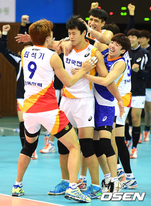 5세트 한국전력 서재덕이 서브 에이스로 승리를 결정짓고 동료선수들과 기뻐하고 있다./jpnews@osen.co.kr