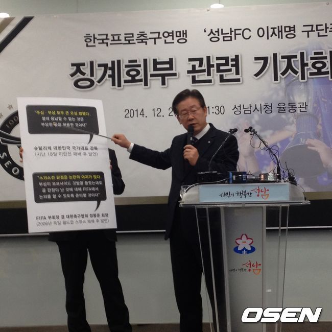 이재명 성남 구단주는 지난 2일 기자회견을 열어 자신이 상벌위원회에 소집되는 것이 법리적으로 부당하다고 항변했다. 연맹이 독소 조항을 갖고 있다며 억울함을 호소했다. 헌법 소원도 불사하겠다며 전면전을 선언했다.