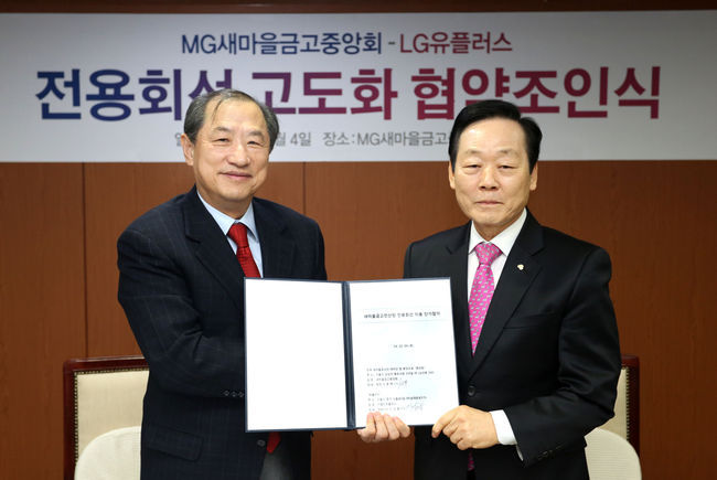 이상철 LG유플러스 부회장(왼쪽)과 신종백 새마을금고중앙회장(오른쪽)이 협력 조인식을 체결하고 있다. / LG유플러스