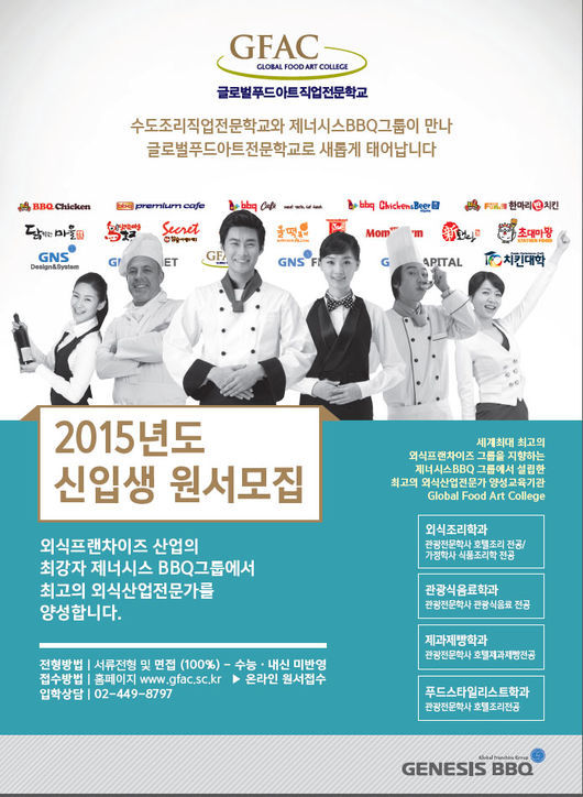 외식 프랜차이즈 그룹 제너시스BBQ는 수도조리직업전문학교와의 합병을 통해 ‘글로벌푸드아트전문학교(GFAC)’를 설립, 오는 5일부터 2015학년도 신입생 모집을 시작한다고 밝혔다.