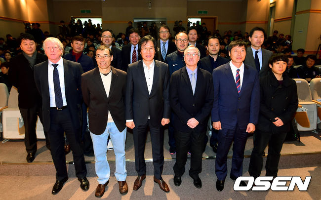 축구 국가대표팀 감독 슈틸리케 감독을 비롯한 발표자들이 행사 시작에 앞서 기념촬영을 하고 있다.