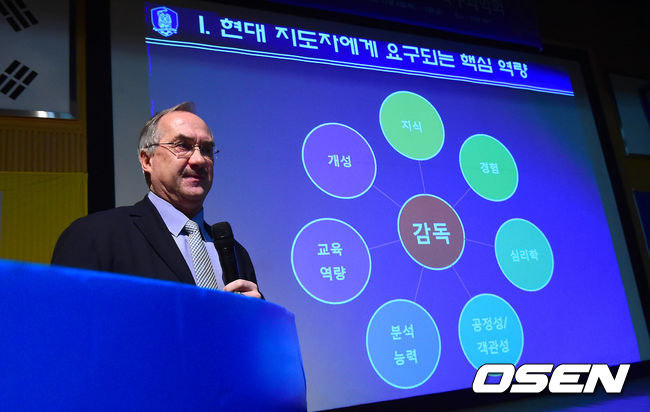 축구 국가대표팀 감독 슈틸리케 감독이 첫 발제자로 나서 강연을 진행하고 있다.