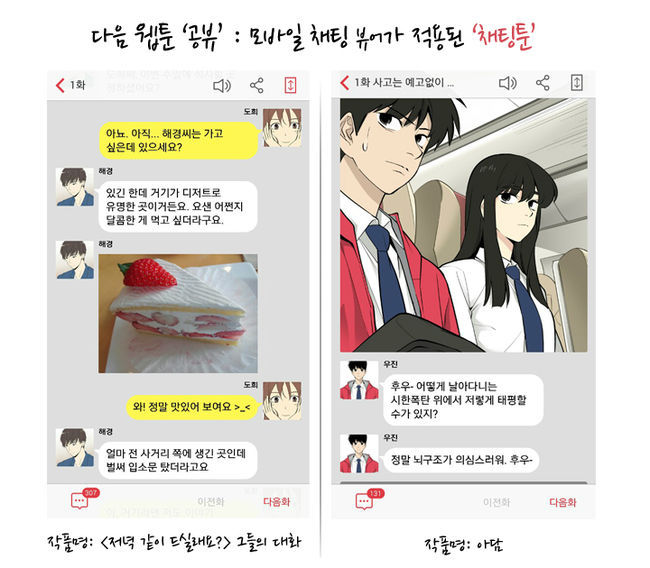 다음 웹툰은 , , 등 총 10편의 작품을 공뷰 웹툰으로 모바일에서 연재하고 있다. 공뷰 웹툰이 오픈된 지난 달 18일부터 현재까지 공뷰 웹툰 콘텐츠에 대한 이용자 반응은 뜨겁다. 공뷰 웹툰 10편의 누적 조회수는 500만건으로, 이 중 는 조회수가 100만건에 달한다. 특히 마치 독자가 등장인물과 메신저 채팅을 하는 듯한 즐거움을 선사하는 채팅툰은 기존 웹툰과는 전혀 다른 신선함을 느낄 수 있다는 평가를 받고 있다.
