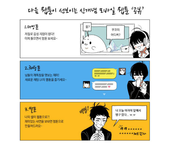 다음카카오(공동대표 최세훈, 이석우)가 음성, 영상 등 다양한 멀티미디어를 결합한 다음 웹툰 '공뷰'를 선보이며, 모바일 시대 신개념 웹툰 장르 개척에 나섰다.