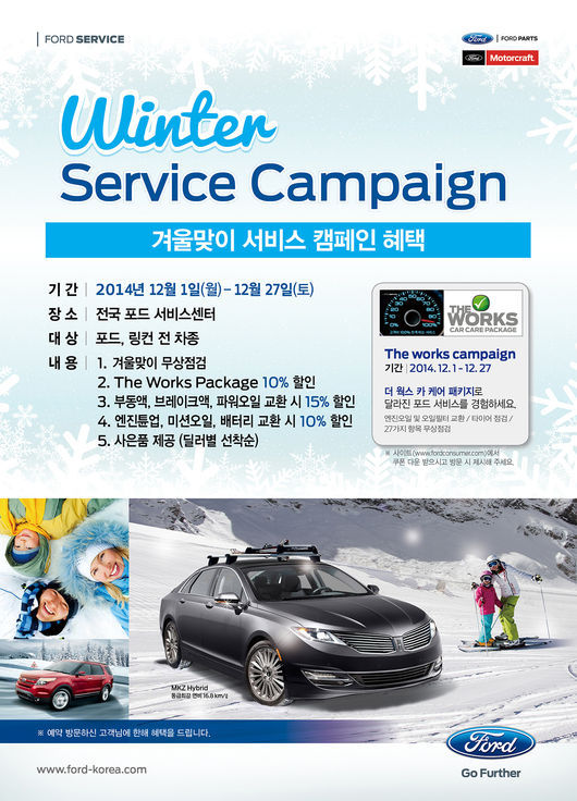 오는 27일까지 진행되는 이번 캠페인은 전국 포드·링컨 서비스 센터에서 모든 차종을 대상으로 진행된다. 포드의 마스터 테크니션이 참여하는 이번 겨울맞이 서비스 캠페인은 겨울철에 꼭 필요한 부동액/브레이크액, 파워오일 교환을 15%, 엔진튠업, 미션오일, 배터리 교환은 10% 할인 제공한다.