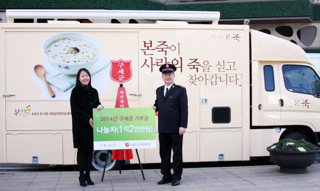 웰빙 죽 전문점 본죽은 소외계층에게 따뜻한 온기가 담긴 ‘죽’을 전달하기 위해 특별 제작한 ‘사랑의 죽, 본죽 나눔차’를 한국 구세군에 기증했다고 4일 밝혔다.