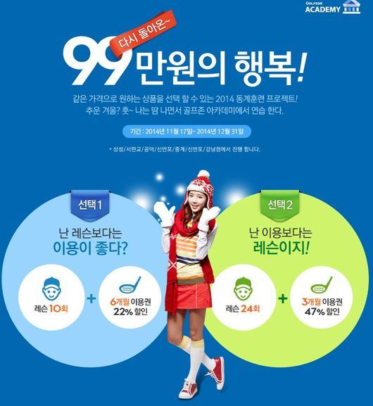 99만 원의 행복은 작년에 시행한 후 이용자들의 요청으로 다시 진행하게 된 인기 레슨 프로그램이다. 내년 골프 시즌을 대비하여 체계적인 레슨과 연습을 겸하고 싶어하는 골퍼들을 위해 기획됐다.