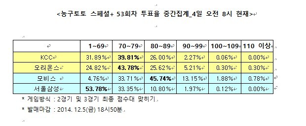 2014-15시즌 KBL 2경기 대상 농구토토 스페셜+ 53회차 투표율 중간집계 결과