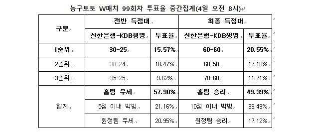 2014-2015시즌 농구토토 W매치 99회차 투표율 중간집계 결과…신한은행 우세 전망