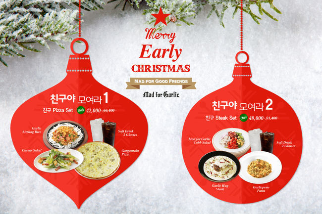 마늘 테마의 이탈리안 레스토랑 매드포갈릭(Mad for Garlic, http://www.madforgarlic.com)이 연말 캠페인인 '매드 포 굿 프렌즈(Mad for Good Friends)의 일환으로 12월 한달 동안 '메리 얼리 크리스마스(Merry Early Christmas)' 프로모션을 진행한다.