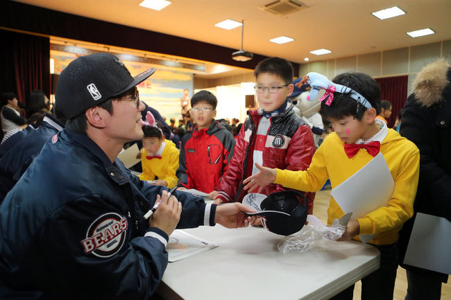두산 베어스 선수단이 4일(목) 은평구 응암동에 위치한 ‘꿈나무 마을’을 방문, 200여명의 원생들과 함께 하는 뜻 깊은 자리를 가졌다.