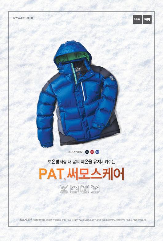 PAT ‘써모스케어 다운 점퍼’는 블랙, 레드, 블루 총 3가지 컬러에 남성용으로 가격은 64만 원이다. 출시 기념 50% 할인 이벤트가 진행 중이다.