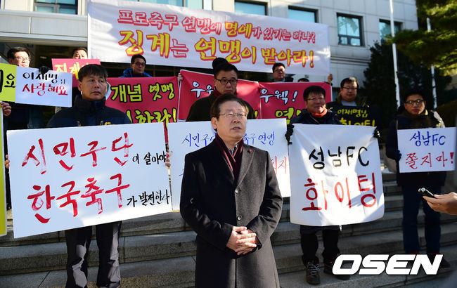 이재명 성남 구단주는 지난 2일 기자회견을 열어 자신이 상벌위원회에 소집되는 것이 법리적으로 부당하다고 항변했다. 연맹이 독소 조항을 갖고 있다며 억울함을 호소했다. 헌법 소원도 불사하겠다며 전면전을 선언했다.