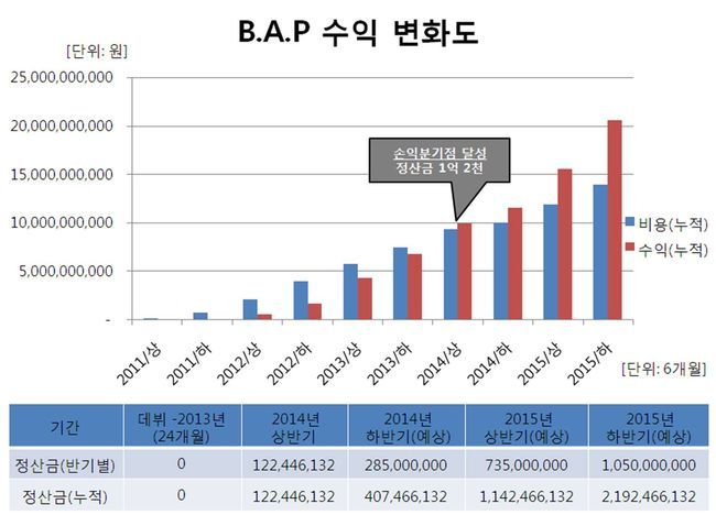 그러면서 "이러한 과감한 투자 덕분에 B.A.P는 차세대 K-POP 아티스트로 자리 잡을 수 있었고, 데뷔한 지 약 2년여 만인 2014년 초에 손익분기점을 넘어서는, 업계에서 괄목할 만한 성과를 이룰 수 있었다. 손익분기점을 넘긴 시점부터는 수익과 비용이 큰 폭으로 벌어지면서 B.A.P는 기하급수적인 수익을 창출하게 된다. 당장 2014년 하반기(7-12월)만 보더라도 남미 투어와 일본 투어 및 중국 행사를 예정대로 소화했다면 총 6억원의 정산금을 예상하고 있었다. 다만, 안타깝게도 본 일정의 취소로 인해 2014년 하반기의 정산 금액은 총 2억 8천 5백만 원이 될 것으로 예상된다"고 설명했다.