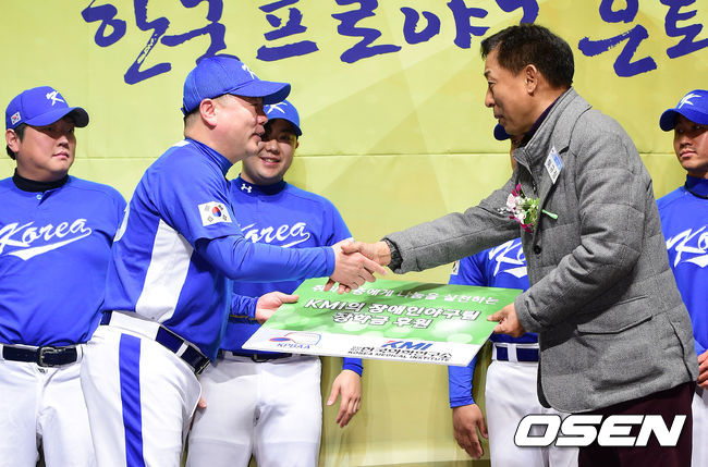 장애인 야구단이 후원 협약식을 갖고 있다.