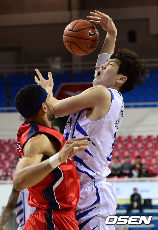 1쿼터 삼성 김준일이 모비스 문태영의 슛블록에 공을 놓치고 있다.