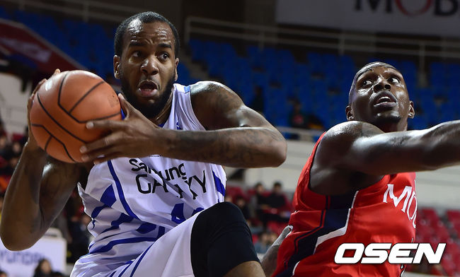 2쿼터 삼성 라이온스가 모비스 라틀리프와의 리바운드 다툼에서 공을 따내고 있다.