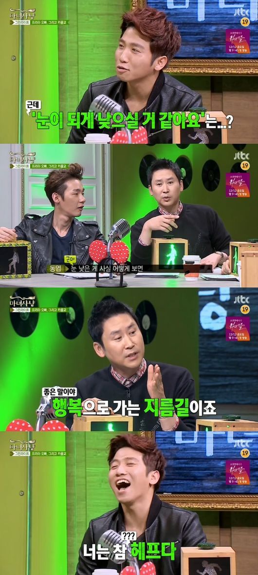 신동엽은 "눈 낮은 게 사실 행복으로 가는 지름길이다"며 "다른 뜻으로는 '너는 참 헤프다'라는 것이다"고 말해 웃음을 자아냈다.
