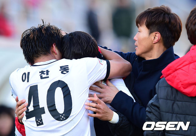 후반 광주 남기일 감독대행이 동점골을 넣은 김호남을 격려하고 있다.