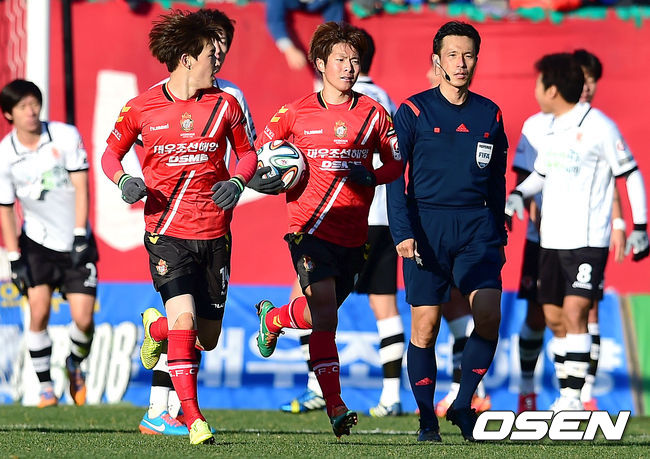 후반 경남 송수영이 선취골을 넣은 뒤 공을 들고 빠르게 하프라인으로 돌아가고 있다.