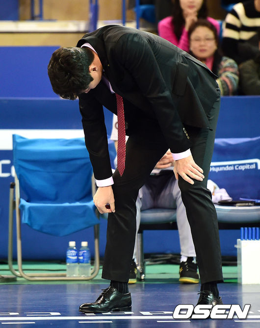4세트 OK저축은행 김세진 감독이 송희채가 서브에 실패하며 실점하자 아쉬워하고 있다.