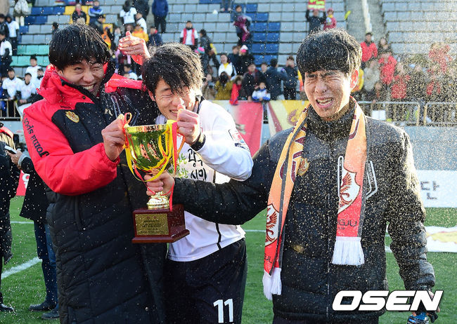 K리그 클래식으로 승격한 광주 임선영, 김호남, 여름이 삼페인 세례를 받고 있다. / youngrae@osen.co.kr