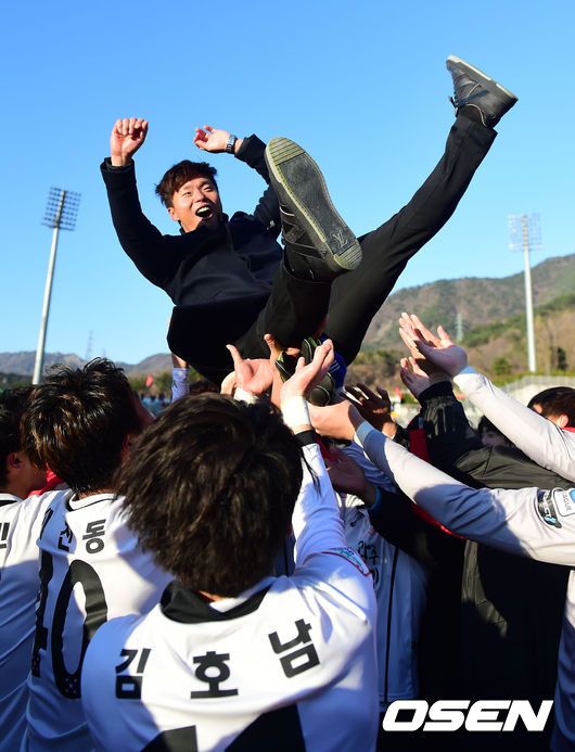 K리그 클래식으로 승격한 광주 남기일 감독대행이 헹가레를 받고 있다. / youngrae@osen.co.kr