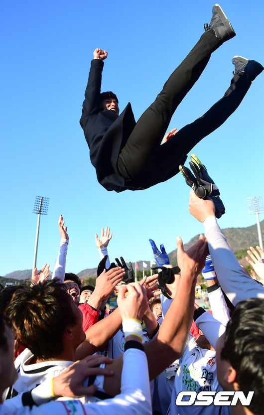 K리그 클래식으로 승격한 광주 남기일 감독대행이 헹가레를 받고 있다. / youngrae@osen.co.kr