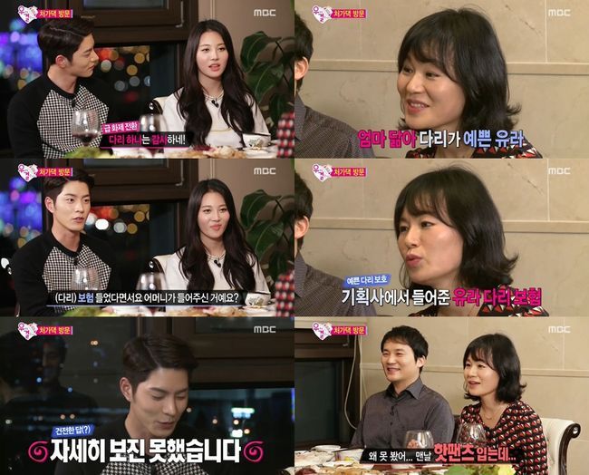 그는 이날 "다리 하나만큼은 물려준 것에 대해 감사하다"고 말했고 이에 유라의 어머니는 "내가 다리가 예쁘긴 하지. 기획사에서 정말 예쁘다고 다리 보험 들라고 하더라"고 자랑했다.