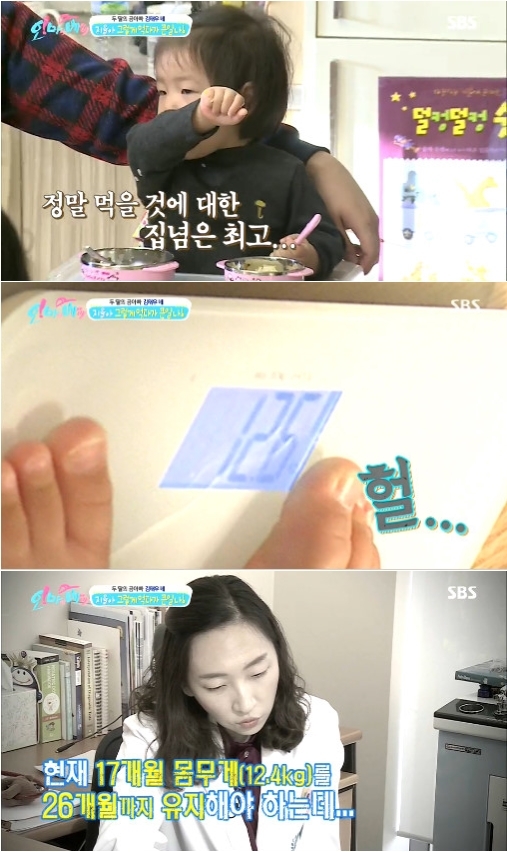 이날 김태우는 지율이의 몸무게가 한달 전 측정한 것 보다 0.2kg 늘어난 12.6kg에 달함을 알게 됐다. 한달 전 건강검진 당시 지율이의 몸무게와 관련해 주의를 들었던 것을 떠올렸다. 현재 17개월의 몸무게를 24개월까지 유지해야 한다는 것.