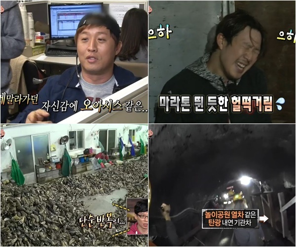 유재석과 차승원은 그야말로 '극한'이었다. 앞도 잘 보이지 않는 탄광에서 이들은 갱 지주를 설치하는 작업을 도왔다. 숨쉬는 것도 힘든데 무거운 걸 들고 날라야 했다. 차승원은 "팔뚝에 알 생길 거 같다"면서 "연예계 생활 20년 중에 제일 힘들다. 정점이다"며 혀를 내둘렀다. 유재석은 "막장은 삶의 터전이다. 막장이라는 표현을 함부로 써선 안될 것 같다"고 말해 여운을 남기기도 했다.