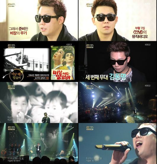 김동명은 6일 방송된 KBS 2TV 예능프로그램 ‘불후의 명곡 전설을 노래하다-故 이봉조 편’에 출연해 현미의 '떠날 때는 말없이'로 무대를 꾸몄다.