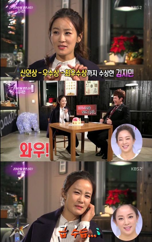김지민은 6일 방송된 KBS 2TV '연예가중계'에서 '2014년을 빛낸 스타'로 꼽혀 간단한 인터뷰를 가졌다.