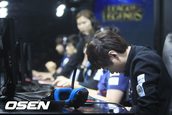 6일 오후 서울 용산 온게임넷 e스포츠 상설경기장에서 '2015 LOL 챔피언스(이하 롤챔스)' 코리아 프리시즌 3회차 2경기 나진과 CJ의 경기가 열렸다. 1세트 패배 후 '매드라이프' 홍민기가 고개를 숙이고 있다.